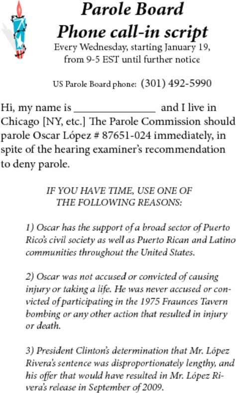 3) President Clinton’s determination that Mr. López Rivera’s sentence was disproportionately lengthy, and his offer that would have resulted in Mr. López Rivera's release in September of 2009. Parole Board Phone call-in script Every Wednesday, starting January 19, from 9-5 EST until further notice US Parole Board phone: (301) 492-5990