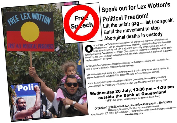 Attend the lunch time speak out outside the Bank of Queensland. Demand the Queensland Government lift the political gag on Lex Wotton now! Stop Aboriginal deaths in custody now!
