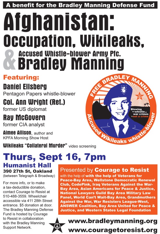 Also join the March and Rally to Free Bradley Manning at 2pm in front of the SF War Memorial Building, 401 Van Ness Avenue, San Francisco, California. 3pm march. 4pm end at Union Square.
